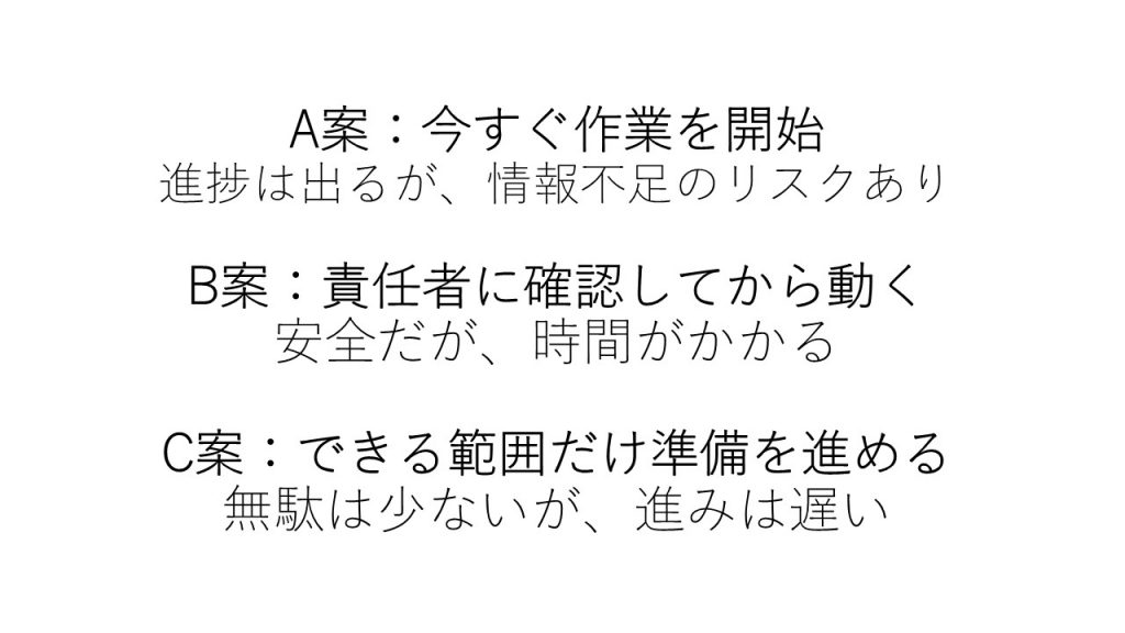 チームとしての結論は「担当者に指示を仰いで確認する」