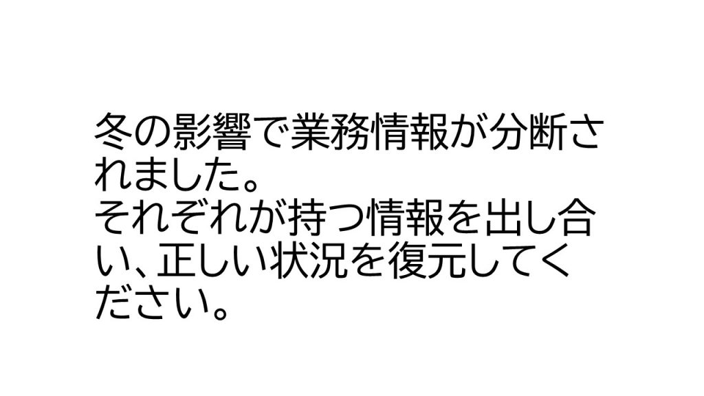①「作業開始は9:00予定だったが、遅延の可能性あり」②「作業に必要な資料が一部不足している」