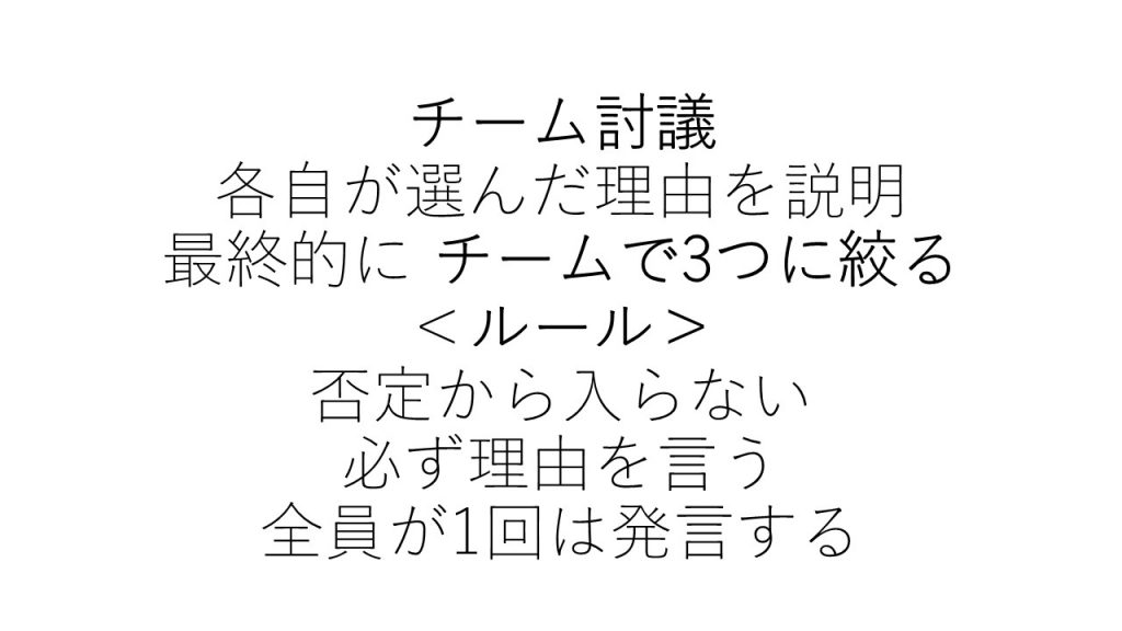 まず自分はどの案が良いかを理由付きで決めていただいてから討議!