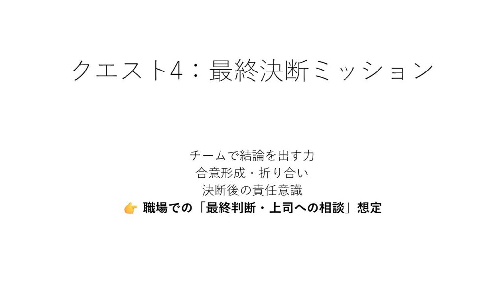 本日のプログラムではチームで協力してミッションに取り組むチームクエストを実施しました。