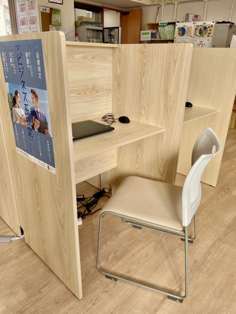 こんにちはフィット鹿児島中央です。フィット鹿児島では、就職に向け、さまざまな資格を取ることが出来ます。その学習を支えているのが、このデスクです。とてもとてもとても、集中できちゃうデスクなんです。気になった方は、見学お待ちしています。