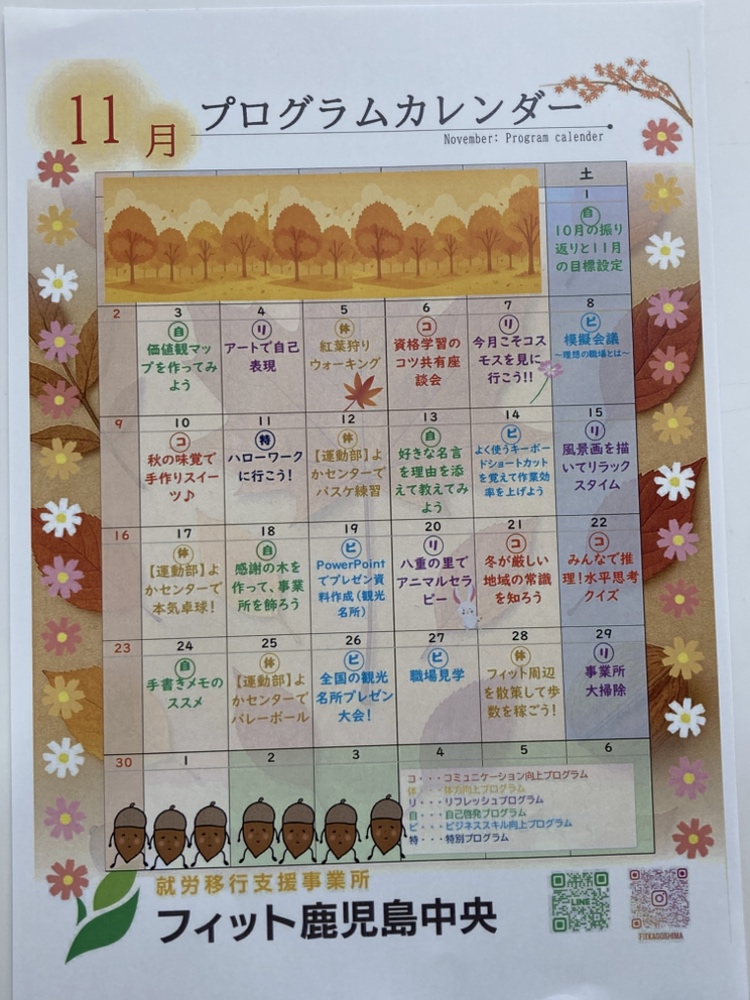 11月に予定している事業所プログラムを記載したカレンダーが完成しました。