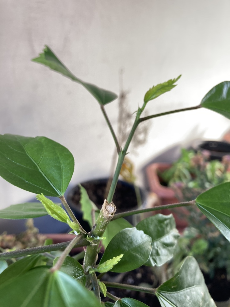 カイガラムシとアリが集まってしまっていたフィットのハイビスカスですが、10月のガーデニングプログラムの際に思い切って伸びていた枝を切ってから、虫の数がぐっと減り、更に新芽も出てきていました。