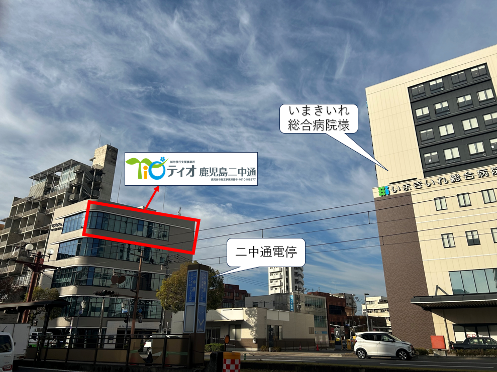 ティオ鹿児島二中通は市電「二中通電停」降りてすぐの「YU FIRST BLDG(ユーファーストビルディング)」5Fにあります✨道路を挟んで向かい側には「いまきいれ総合病院」様があります🏥