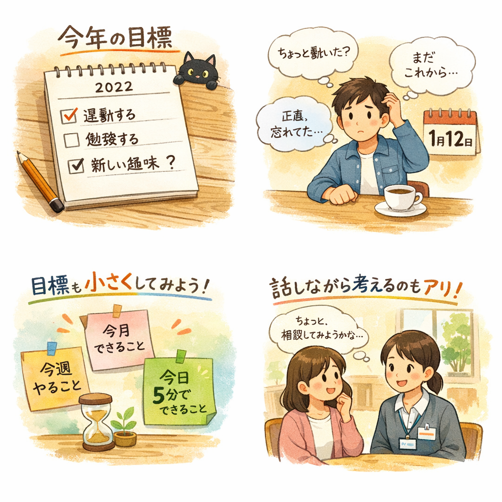 実はこの時期、目標を見直すにはちょうどいいタイミングなんです。「続けられそう?」「今の生活に合ってる?」と、少し現実目線で考えてみるだけでも前進です。