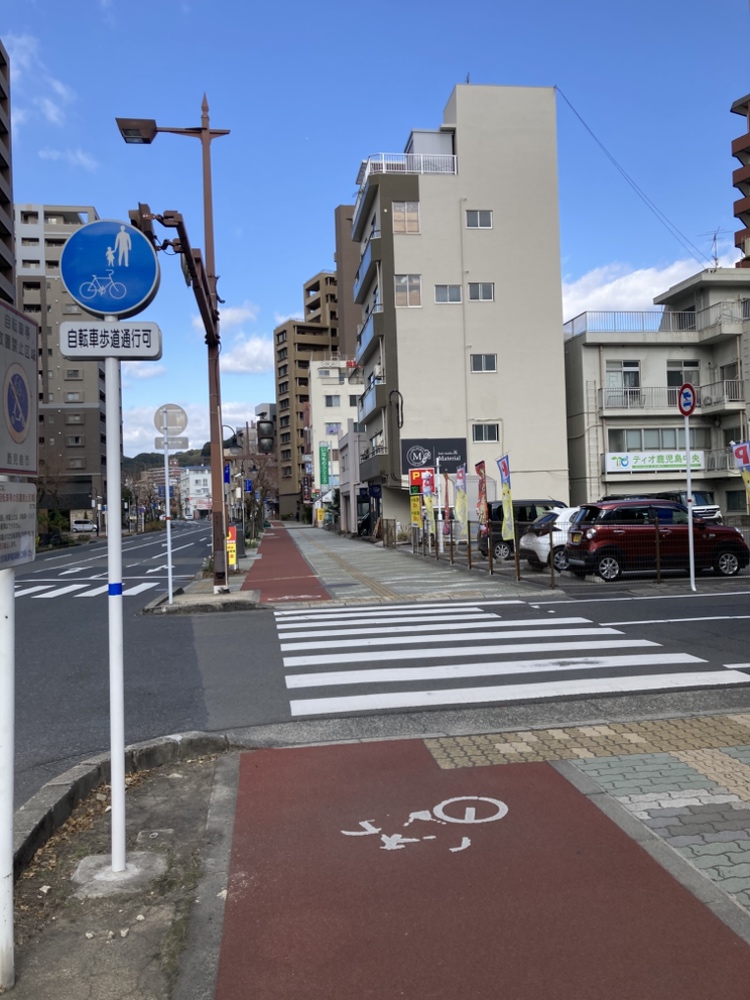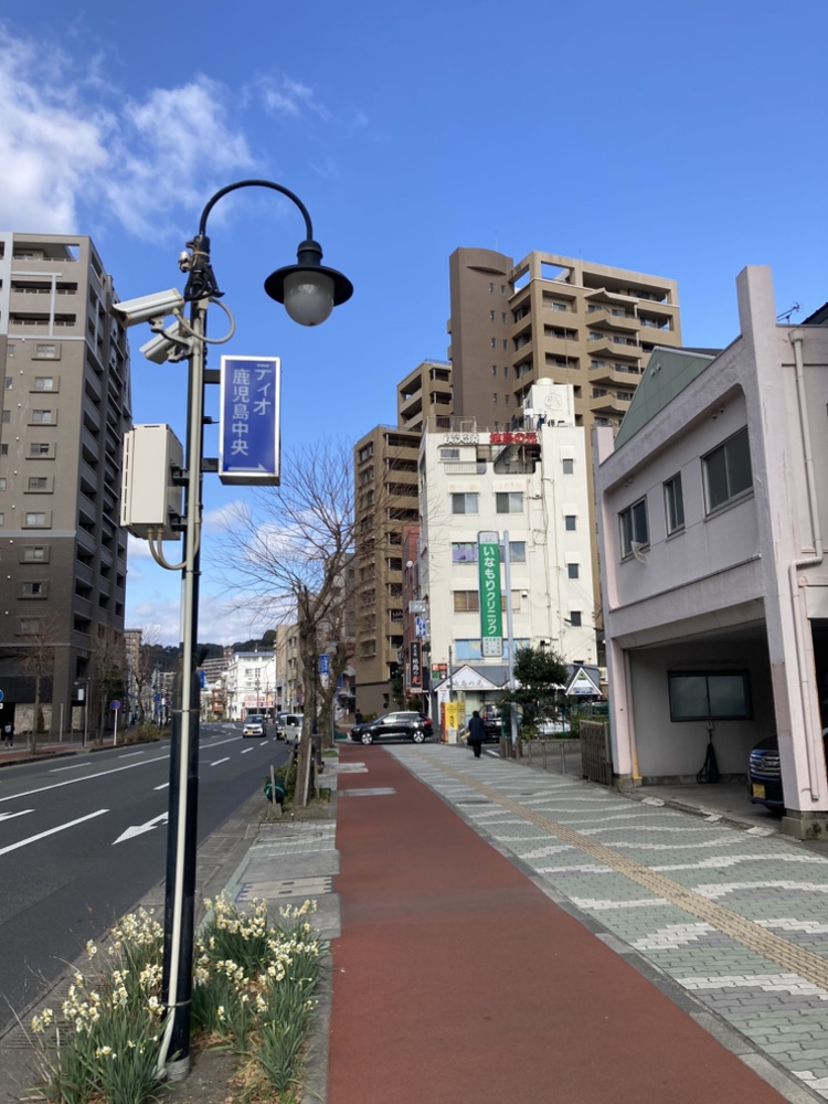 正面の横断歩道の先、右手にはコインパーキング。そこにはティオ鹿児島中央の看板が見えてきます!