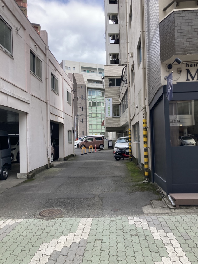 ピンクの建物と、美容室Materialさんの間に車一台分が通れる道があるので、右折!